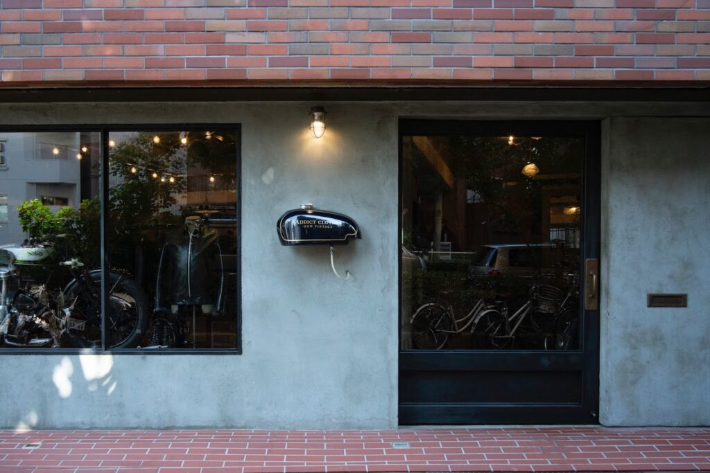 四谷駅から数分歩くとアディクトクローズはあり、周りの雰囲気は非常に落ち着いており、騒がしい原宿のルイスレザーとは対照的だ、店舗のデザインもすっきりしており、ショップサインはベロセット(?)のタンクに入っている!いい感じだ。
